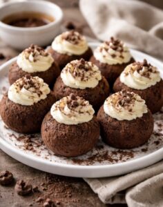 Pui un moț de cremă deasupra fiecărei bile, presari cacao prin sită amestecata cu puțină cafea măcinată fin sau ciocolată rasă.