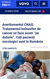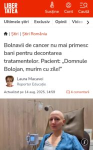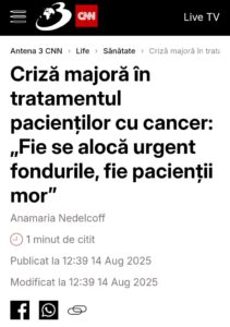 Federația Asociațiilor Bolnavilor de Cancer a anunțat că CNAS a rămas fără bani pentru a deconta tratamentele oncologice planificate pentru anul curent. În practică, asta înseamnă că pacienții nu mai pot primi unele tratamente sau medicamente compensate din sistemul public pentru că banii alocați s‑au terminat. Pacienți au declarat că sunt obligați să‑și cumpere singuri tratamente pe care înainte le deconta statul.