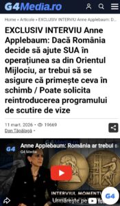 Anne Applebaum – jurnalistă, istorică, autoare americană, specializată în politică internațională, Europa de Est și istoria comunismului, una din cele mai obiective analiste a situației geopolitice din Europa de Est – susține că România ar trebui să negocieze ceva în schimb, cum ar fi :