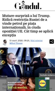 ● Administrația Trump a relaxat temporar sancțiunile împotriva Rusiei pentru 30 de zile. Asta înseamnă ca Rusia poate vinde aproximativ 100–128 milioane de barili pe piața globală.