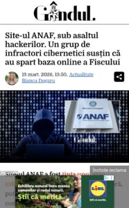 ● Site-ul Agenției Naționale de Administrare Fiscală a fost atacat cibernetic pe 13 martie 2026. Hackerii au lansat un atac informatic asupra site-ului ANAF, care a provocat probleme de acces sau/și blocarea temporară